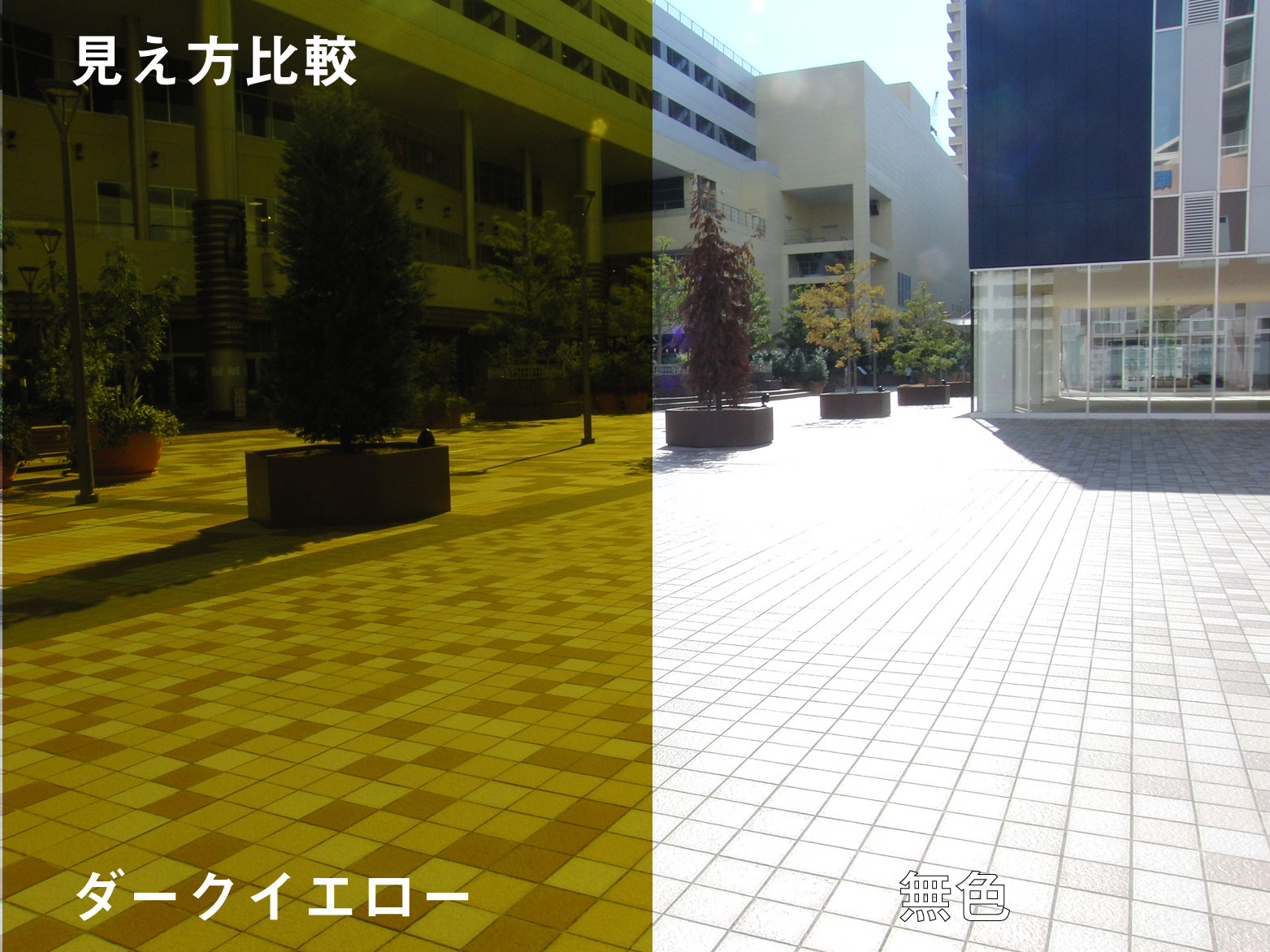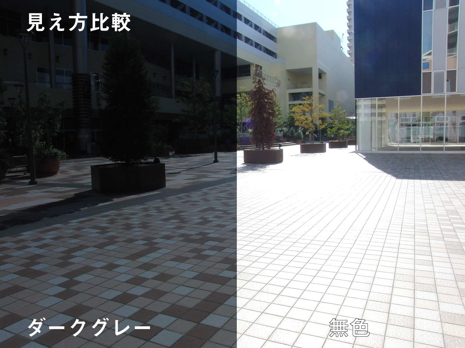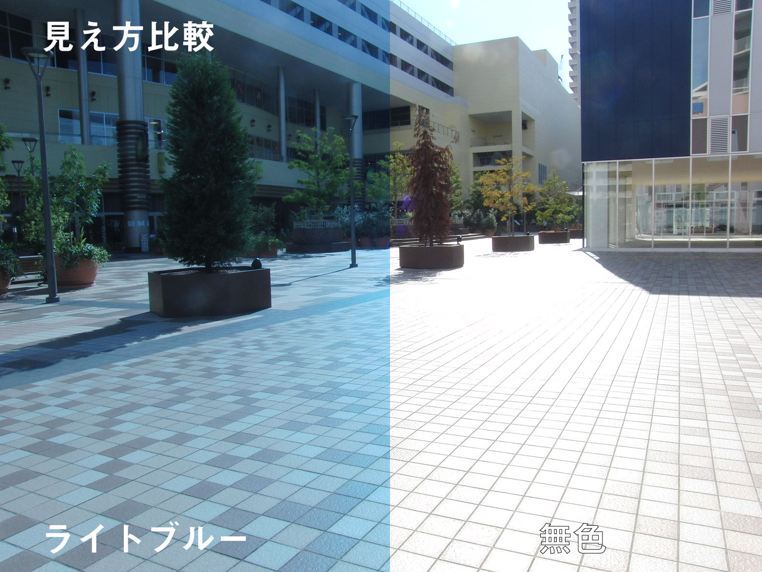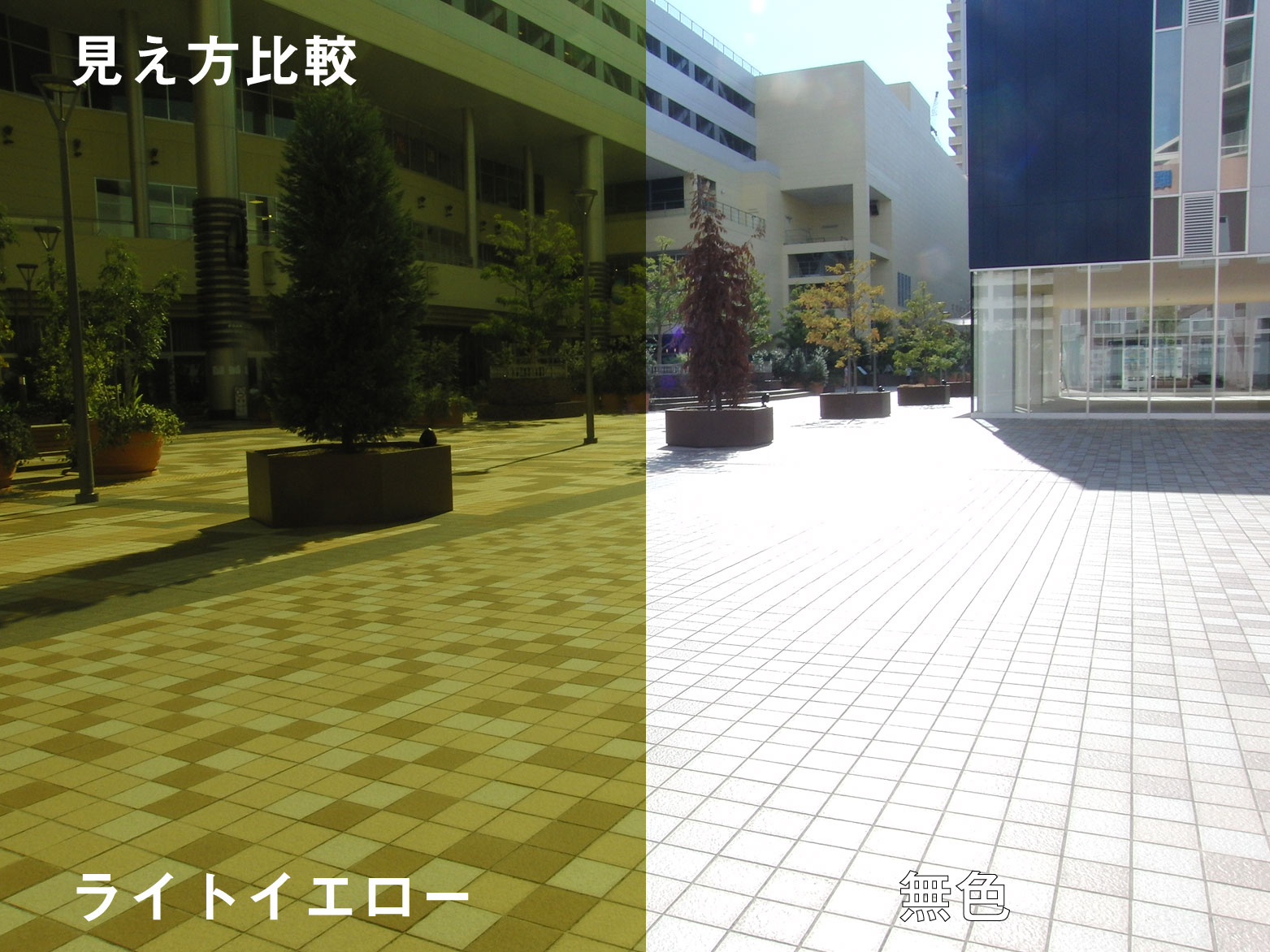 何もないと光の反射で地面のタイルが真っ白ですが偏光レンズを通すとしっかり色が違うのがわかりますね