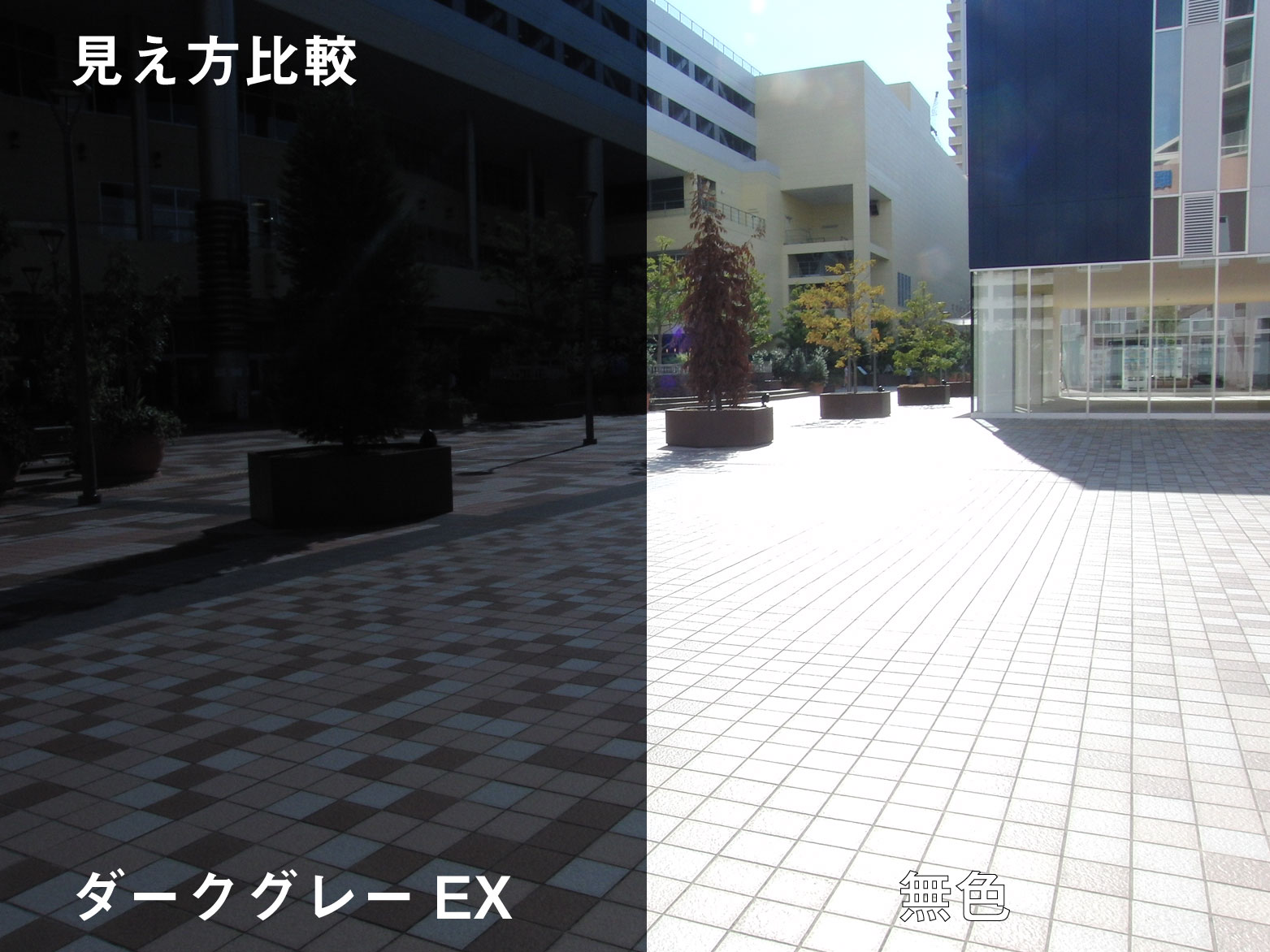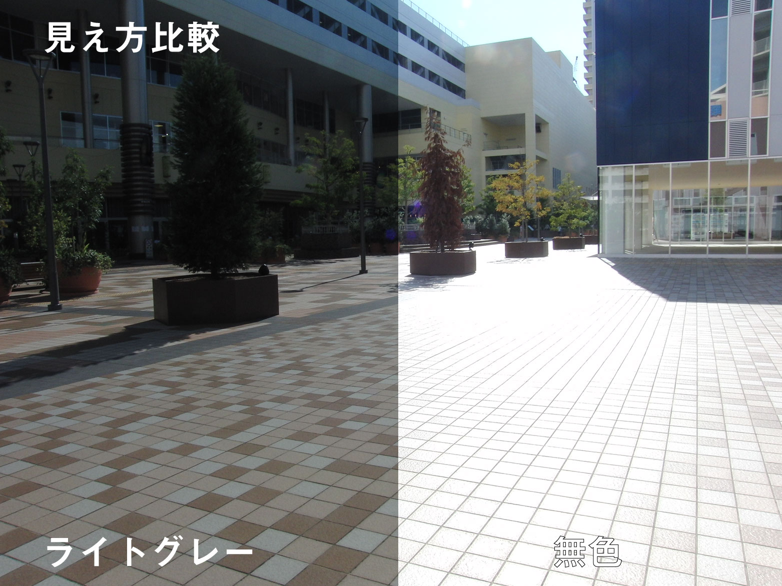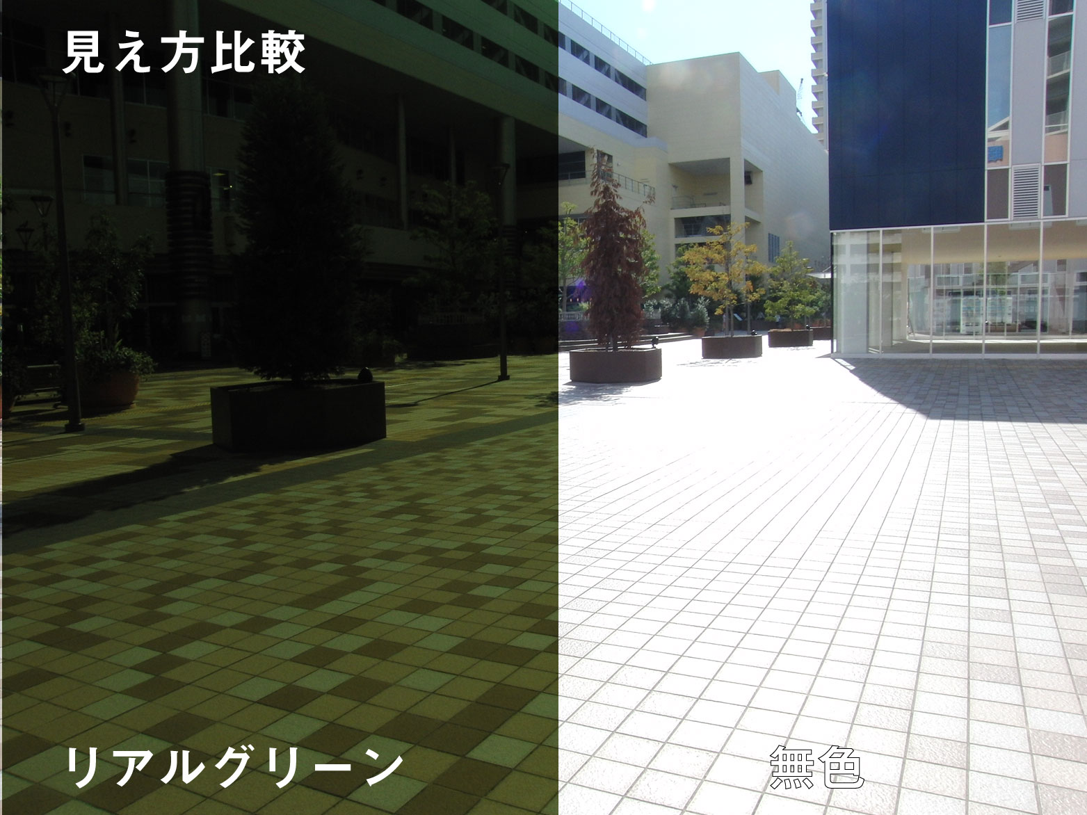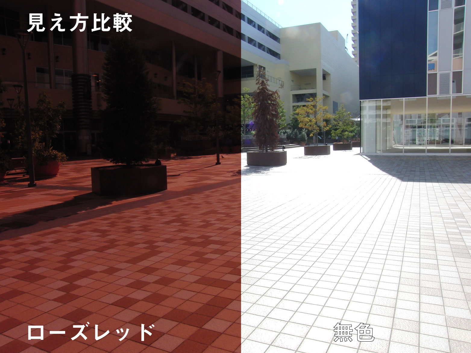 何もないと光の反射で地面のタイルが真っ白ですが偏光レンズを通すとしっかり色が違うのがわかりますね