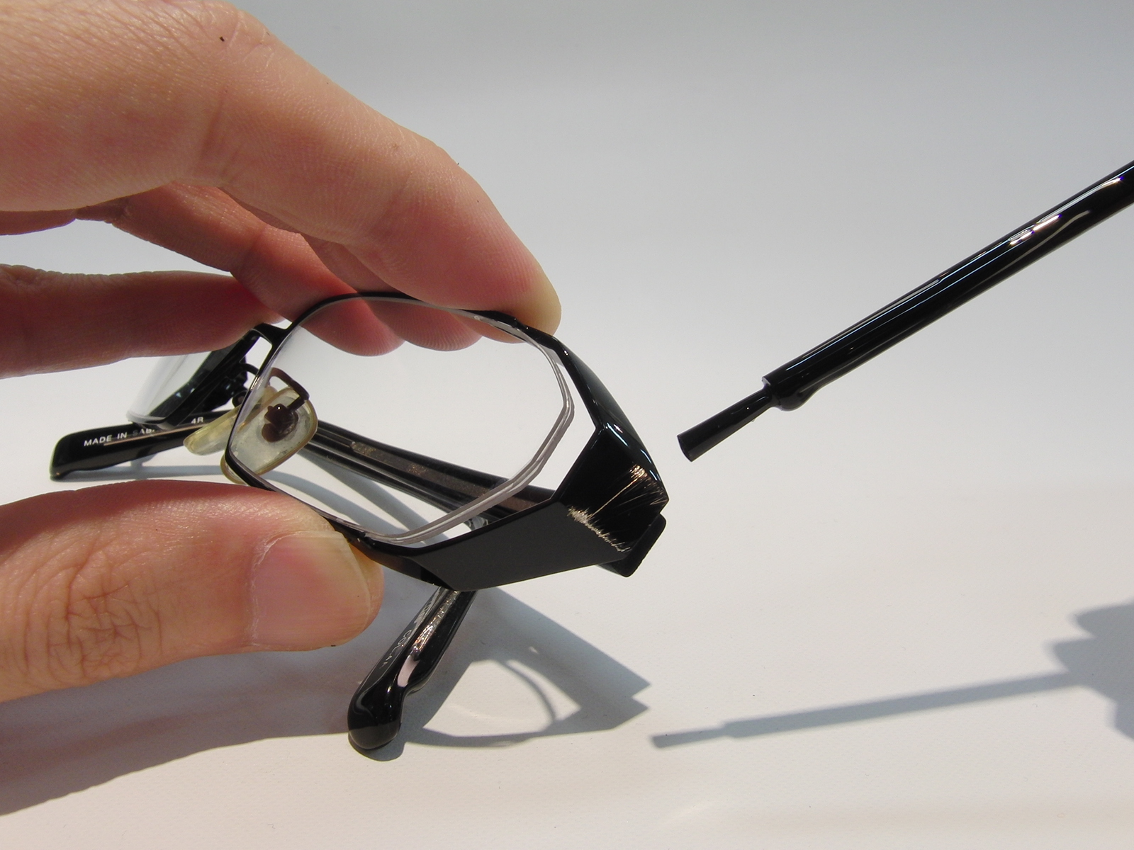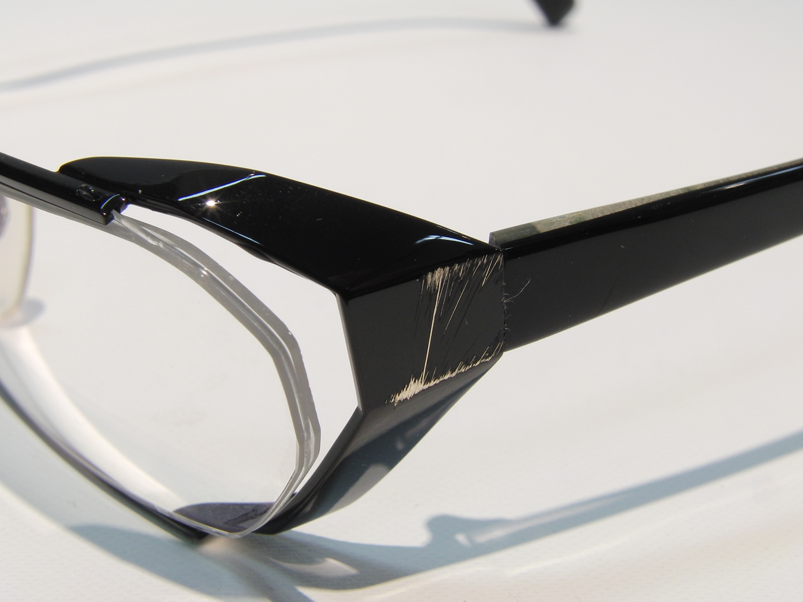 「メガネにキズがいった、しかも黒いフレームだから下地の金属の色が目立つな~、でも給料日まで持たせたいけど見た目がチョットどうしよう」