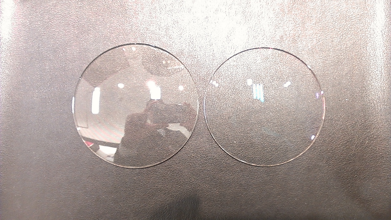 ↓の画像を見ればわかるかと思いますが、左のレンズは人が写っていますよね、対して右のレンズは蛍光灯の反射が少し見えるぐらい