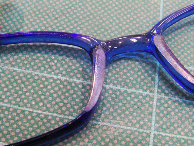 しかし最近になって他店で買われたTR-90のメガネで鼻が高すぎて目とレンズは離れ過ぎるお客様がいて、見え方がしっくりこないとの事だったので鼻の部分を削ってほしいとの相談を受けました、それで実際に削ってみると「あれ?結構弾力あるやん」⇒これならけるかも…と思ったわけです。