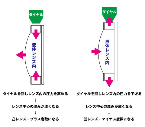 「POV」=レンズ内の液体(シリコンオイル)の圧力を調節する事でレンズの厚みを変化させ度数を調節する、度数決定後はダイヤル部分を取りはずすことも可能(その場合再調整は不可)
