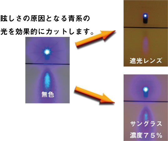 ちなみに偏光レンズ(ヘンコウレンズ)は光の乱反射を防ぎ照り返し等の光を通さないレンズのことで、調光レンズ(チョウコウレンズ)は紫外線に反応して色が濃くなるレンズのことです、遮光レンズはそのどれとも違い青い光だけを効果的にさえぎるレンズのことです。